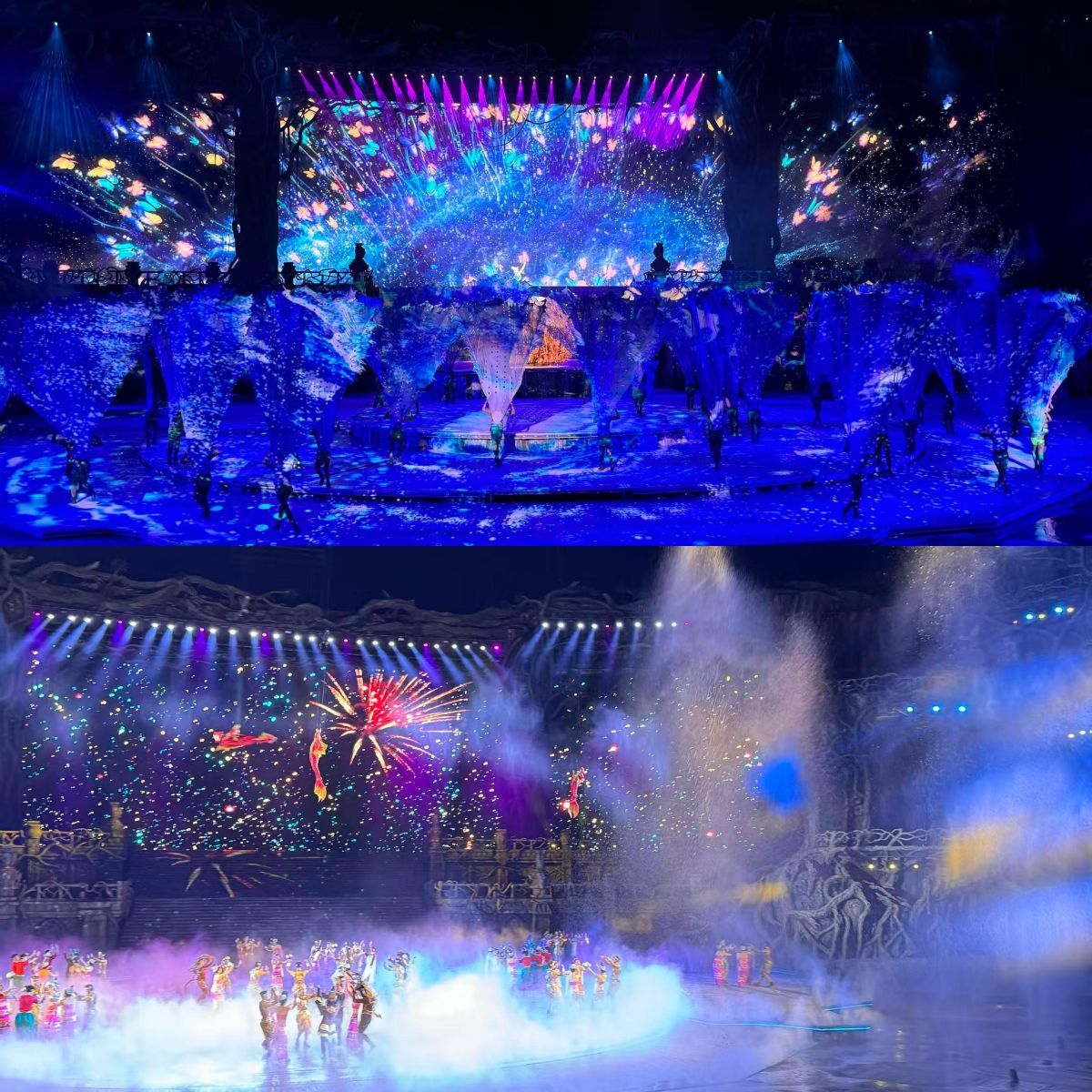 演出的舞臺堪稱視覺奇觀:14000 平方米的巨型舞臺依山而建,30 米高的實景瀑布奔騰而下,與 1200 平方米裸眼 3D 大屏交相輝映。270 度環(huán)幕將觀眾包裹其中,水陸空立體演繹讓孔雀公主的翩躚舞姿、雨林的蔥郁秘境近在咫尺,無需佩戴任何設備,便能感受神話場景破壁而來的震撼。當傣族非遺孔雀舞遇上現(xiàn)代光影技術(shù),舞者靈動的 “三道彎” 身姿與裸眼 3D 呈現(xiàn)的孔雀羽翼交織,千年非遺在科技賦能下煥發(fā)新生,完美詮釋了東方美學的獨特韻味。