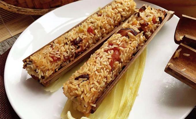 香竹烤飯也用的是糯米,把糯米裝入特有的幼嫩香竹中,加水浸泡,再用文火燒烤。