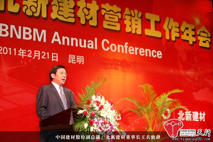 2月21日,北新建材2011年?duì)I銷(xiāo)工作年會(huì)在昆明隆重舉行,中國(guó)建材集團(tuán)董事兼中國(guó)建材股份有限公司總裁曹江林出席大會(huì)并做重要講話(huà),《中國(guó)建材報(bào)》社社長(zhǎng)陳才來(lái)、《中國(guó)建設(shè)報(bào)》社副社長(zhǎng)翟建、《中華建筑報(bào)》社總編鄧千等應(yīng)邀出席大會(huì),北新建材董事長(zhǎng)王兵致歡迎辭并做營(yíng)銷(xiāo)工作報(bào)告。