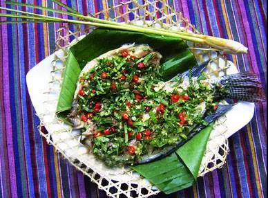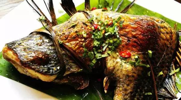 把魚的鱗片去掉,用刀劃開魚背,去掉腸肚雜物,洗凈;將蔥、姜、蒜、青辣椒、芫荽切細(xì),與鹽拌攏;把佐料放進(jìn)魚肚子里,把魚肚子合攏,用二三根香茅草葉捆好,用竹片夾緊,放在火炭上烘烤。待八成熟時(shí),抹上豬油,繼續(xù)烘烤5分鐘左右,即可食用。這種烤魚具有香、酥、脆的特點(diǎn),極能增進(jìn)食欲。