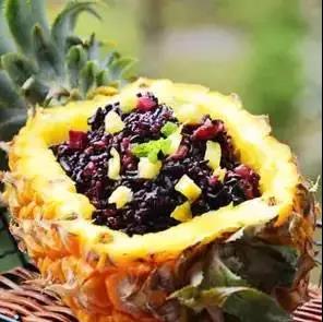 菠蘿紫米飯是具有傣族特色的糯制食品。制作時(shí),首先要把紫糯米用水浸泡七到八小時(shí),然后淘洗干凈,與剁細(xì)的豬肉攪拌均勻,把準(zhǔn)備好的菠蘿用刀在其頂端切出一個(gè)蓋,然后掏去菠蘿心,放入紫糯米,再把切去的蓋蓋上,放到甑鍋里蒸熟,當(dāng)散發(fā)出誘人的香味時(shí),即可食用。其味香甜可口,并有補(bǔ)血潤(rùn)肺之功效