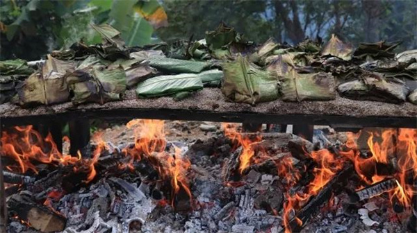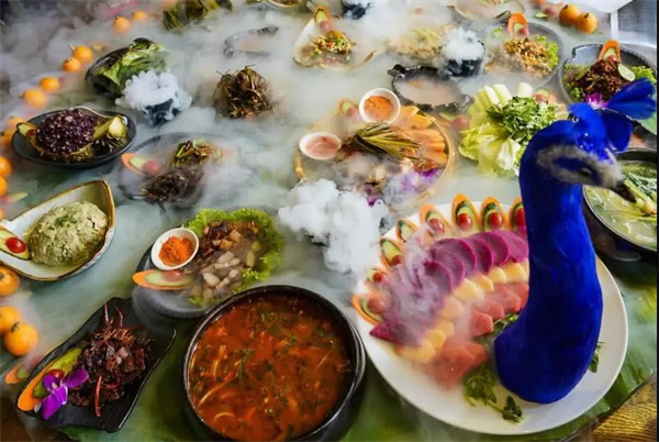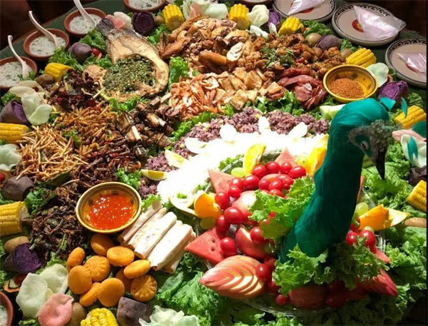 孔雀宴的食材均采用的是德宏本地原生態(tài)食材,包括德宏遮放貢米,德宏竹米,德宏樹毛衣,德宏樹蝴蝶,德宏酸螞蟻等,這些食材不僅僅是純天然無污染,更重要的是這些食材均采自云南德宏的大山。孔雀宴由18種傣族特色菜肴組成:風味炸排骨、炸蝗蟲、炒甜筍、烤魚、烤豬皮、烤五花肉、炸腸子、鬼雞、舂牛干巴、姜絲拌雞樅、炸竹蟲、土豆泥、涼拌刺五加、包燒豆腐、套炸香蕉、雞蛋芭蕉花餅、泡魯達、牛扒乎等組成。當18道美味依次排開,呈現(xiàn)一個孔雀開屏的樣式時,讓人賞心悅目。來過西雙版納旅游的人,對“包燒”一定不陌生。以天然的芭蕉葉為烹飪工具,將食材和佐料包在其中,之后放入炭火塘進行烤制,當打開芭蕉葉的一瞬間,香氣撲鼻,嘗一口酸辣咸香。再加上芭蕉葉的遮掩,每次打開包燒都有一種開盲盒的快感。