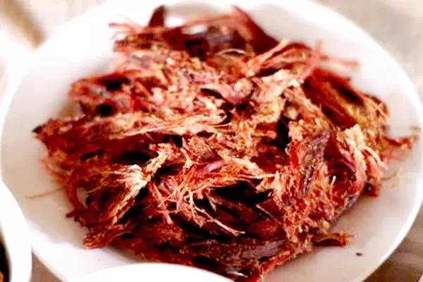 傣味牛干巴是烤熟后用木槌打散打松后用手撕著吃,這種干巴耐嚼,味道香。