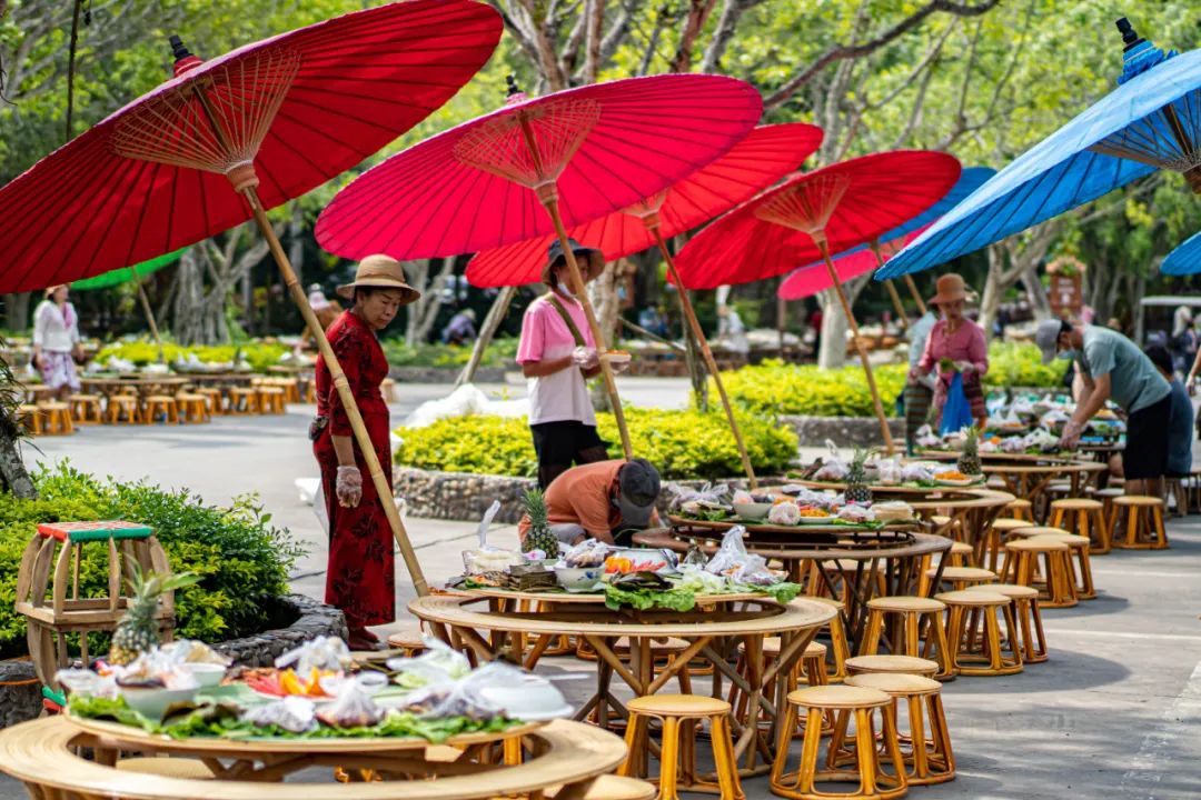5月28日,隨著炫彩旅行社的大型旅游團(tuán)隊(duì)陸續(xù)抵達(dá),西雙版納傣族園景區(qū)迎來首個(gè)萬人規(guī)模大型旅游團(tuán)隊(duì)。景區(qū)以舉辦“長街宴”活動(dòng)的最高規(guī)格來迎接遠(yuǎn)道而來的游客。“打起象腳鼓,敲響金铓鑼……”當(dāng)游客來到景區(qū),美麗的傣家“哨哆哩”(傣語:姑娘)唱起祝酒歌、跳起迎賓舞,熱情邀請(qǐng)游客參與傣族園“長街宴”活動(dòng)。賓客匯聚在充滿傣族風(fēng)情的潑水大道上,歌聲、笑聲、掌聲在這里久久回蕩,場(chǎng)面蔚為壯觀。傣家烤雞、香茅草烤魚、手撕豬肉干巴、芭蕉葉蒸肉、手抓三色飯……隨著一盤盤散發(fā)著熱氣和香氣的菜肴端上桌,一條特色小吃“長龍”呈現(xiàn)在眼前,讓外地游客迫不及待想要品嘗傣族園“長街宴”上的美味佳肴。近年來,西雙版納傣族園景區(qū)充分發(fā)揮文化和旅游行業(yè)資源優(yōu)勢(shì),通過探索“旅游+產(chǎn)業(yè)+就業(yè)”的多種聯(lián)動(dòng)發(fā)展模式,不斷推進(jìn)周邊緊鄰傣族村寨群眾創(chuàng)業(yè)就業(yè),帶動(dòng)村內(nèi)傣家樂餐廳、特色民宿等產(chǎn)業(yè)發(fā)展,在推進(jìn)鄉(xiāng)村振興的同時(shí),讓傳統(tǒng)文化更富魅力,實(shí)現(xiàn)鄉(xiāng)村旅游效益提升,推動(dòng)產(chǎn)業(yè)鏈條延伸、融合發(fā)展,提高鄉(xiāng)村整體經(jīng)濟(jì)實(shí)力,推動(dòng)全域旅游業(yè)高質(zhì)量快速發(fā)展。
