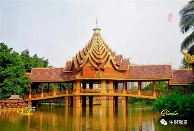 你看,那層層疊疊的橋頂,金碧輝煌的靚色,又有綠意盎然的熱帶植物、綠水碧波的放生湖水作映襯,好一幅令人心曠神怡的自然天成與人工建筑美妙結(jié)合的畫卷!