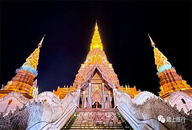 大金塔身高66.6米,寓意一江(中國境內(nèi)稱滄瀾江,境外叫湄公河)連接六國(中國、老撾、緬甸、泰國、柬埔寨、越南)氣勢磅礴,金碧輝煌,更是夜市里璀璨的明珠,出淤泥而不染,莊嚴神圣。具有非常明顯的傣族藝術(shù)風格和東南亞佛教建筑風格特征。大金塔東南西北各有一條龍道,龍身雕琢細致精美,閃耀著五彩斑斕的彩色鱗片,神情莊嚴,惟妙惟肖。