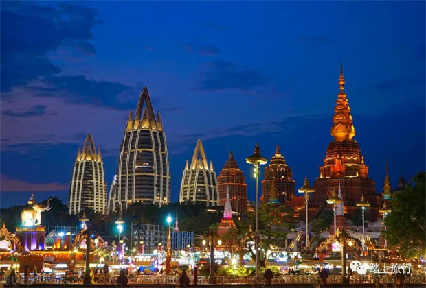 來西雙版納一定不能錯過的就是告莊的星空夜市,是東南亞最大的夜市,全長2000多米,宛如星空一般,街上掛著五彩斑斕的傣式燈籠,古色古香的油紙傘,游人來往如織。在星空籠罩下的大金塔光彩奪目,熠熠生輝,如夢如幻,整條街道沐浴在人間煙火之中,生機勃勃,熱鬧非凡。