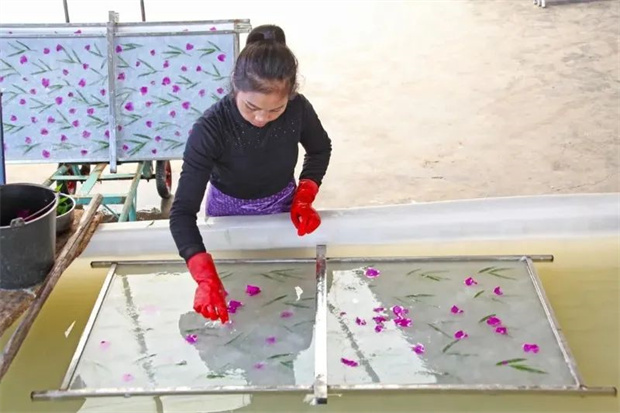 傣族傳統(tǒng)手工造紙術(shù)有著悠久的歷史,傣語(yǔ)稱這種紙為“嘎臘”,2006年,傣族造紙工藝被納入首批國(guó)家級(jí)非物質(zhì)文化遺產(chǎn)名錄和云南省第一批非物質(zhì)文化遺產(chǎn)保護(hù)名錄。傣紙制作主要以構(gòu)樹皮為原材料,經(jīng)過(guò)“浸泡、蒸發(fā)、搗漿、澆紙、曬紙”共5步流程11道工序才算制作完成,在制作過(guò)程中除一口鐵鍋外,制作器具皆采用竹木器具輔以石塊進(jìn)行,因傣族造紙始終保留著較為傳統(tǒng)的制作流程和制作技藝,讓傣紙始終保持著天然、古樸的特性。